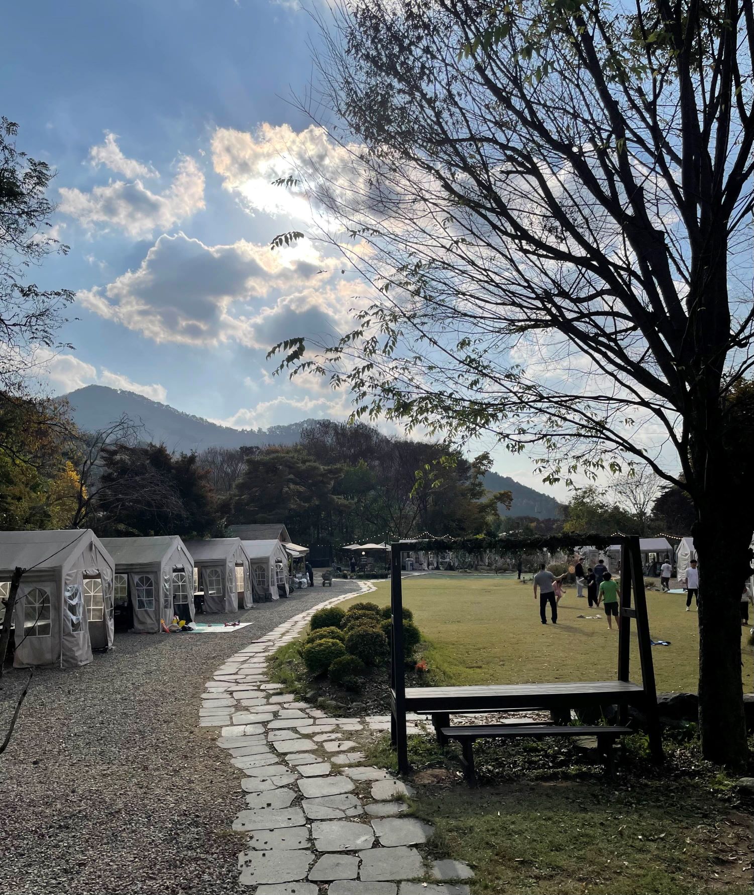 오르빛 정원은 경기도 광주에 위치한 바베큐 플레이스입니다. 캠핑을 다니는 가족은 아니지만 캠핑 분위기 내면서 야외에서 바비큐 하는 걸 좋아하는 가족이라서 마땅한 장소를 물색하다 서치 끝에 알게 된 곳인데 주변 자연의 풍경도 너무 예쁘고 시설도 깨끗한 곳이라 바비큐가 생각날 때마다 종종 방문하는 곳입니다. 오르빛 정원에 도착하면 주차장에 주차 후 바로 보이는 오르빛 정원 카페에서 예약 확인을 하고 선착순으로 자리를 고를 수 있습니다. 중앙부의 널따란 잔디정원을 둘러싸고 1번부터 24번까지의 텐트가 시계 방향으로 빙 돌며 배치되어 있는데 그중 원하는 위치의 텐트를 선택하면 됩니다. 개별 텐트 안에는 테이블과 여러 명이 앉을 수 있는 긴 벤치가 양쪽으로 마련되어 있는데 텐트 1개에 최대 4인으로 예약을 받고 있지만 내부 공간이 꽤 넉넉한 편이라 6인정도 들어가서 함께 식사하기에도 무리가 없어 보이는 사이즈입니다. 다른 것보다 오르빛 정원의 가장 큰 장점은 바로 아름다운 풍경과 분위기입니다. 예쁜 숲을 끼고 있는 아늑한 정원에 들어와 가족들과 함께 바비큐를 하고 여유롭게 시간을 보내는 동안 주변 산과 하늘, 바로 옆에 흐르는 개울에서 자연의 아름다움을 듬뿍 느끼고 돌아올 수 있습니다. 또 한가운데에는 넓은 잔디 정원이 있어서 아이들과 함께 온 가족들은 이곳에서 배드민턴, 공놀이 등을 하며 즐길 수도 있습니다. 바비큐 메인 메뉴인 고기나 해산물, 야채 등은 따로 판매하지 않아서 준비해 와야 하고 그 외에 음료, 라면, 햇반, 간단한 간식거리등은 모두 오르빛 정원 카페에서 구입할 수 있습니다.